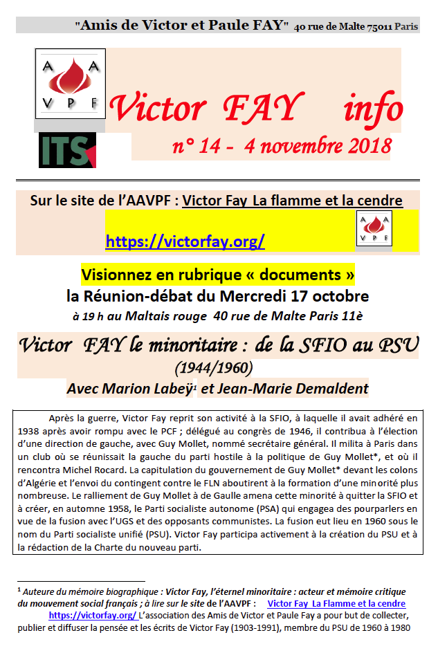 Rappel : le mémoire biographique de Marion Labeÿ : Victor Fay, l’éternel minoritaire : acteur et mémoire critique du mouvement social français  est consultable à l’Institut Tribune Socialiste (ITS) 40 rue de Malte 75011 Paris.